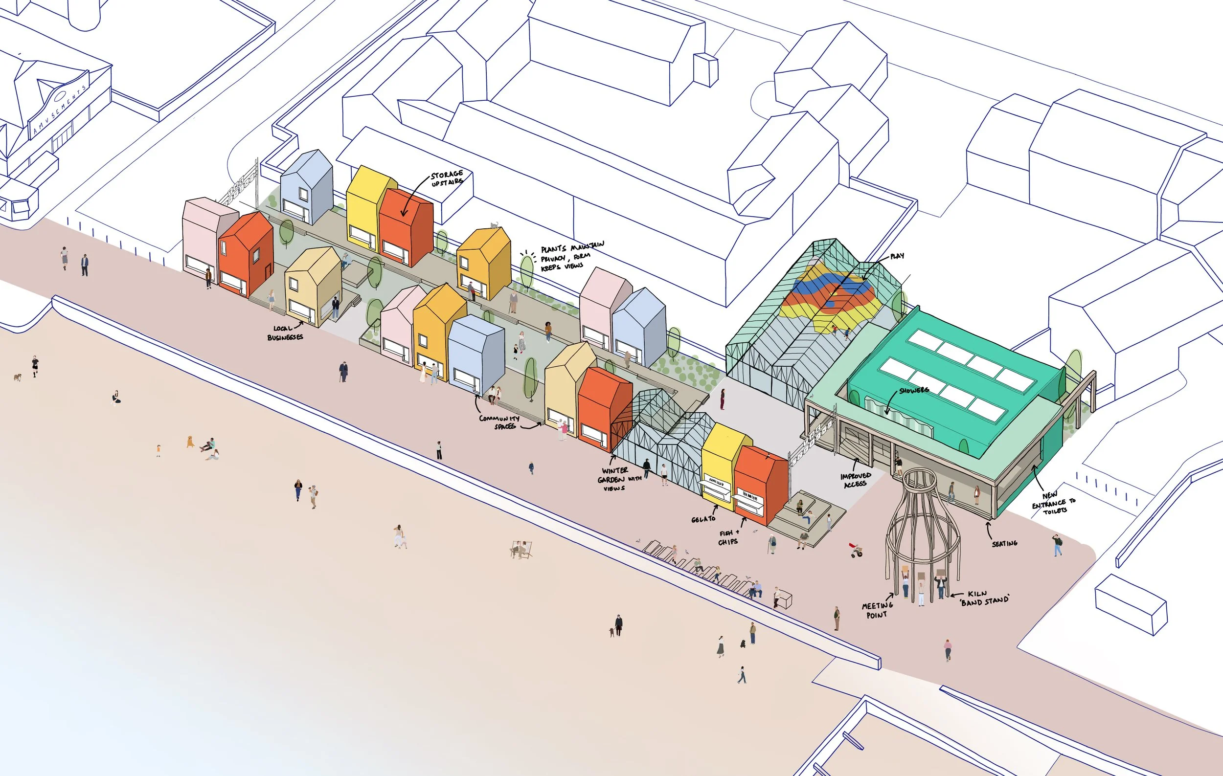 Anchoring the scheme is a new bandstand—an open, playful structure designed as a stage for performances, gatherings, and civic events. Positioned to embrace the promenade and sea views, it offers a focal point for festivals, music, storytelling, and informal daily use.