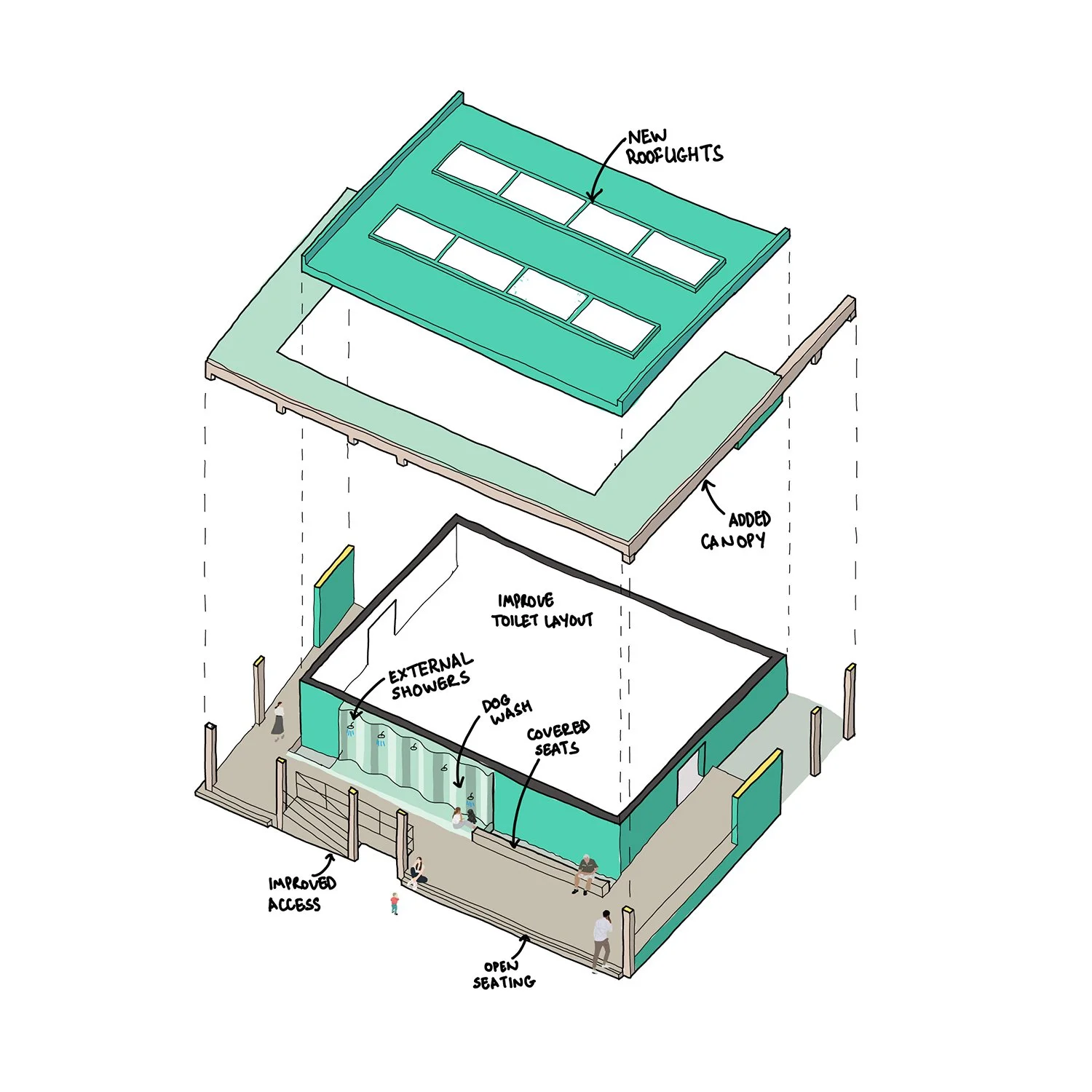 The existing toilet block will be refurbished and added to, including improved accessibility, showers, and sheltered seating, creating a more inclusive and comfortable facility for residents and visitors alike. Its reuse avoids unnecessary demolition while breathing new life into a much-needed public amenity.